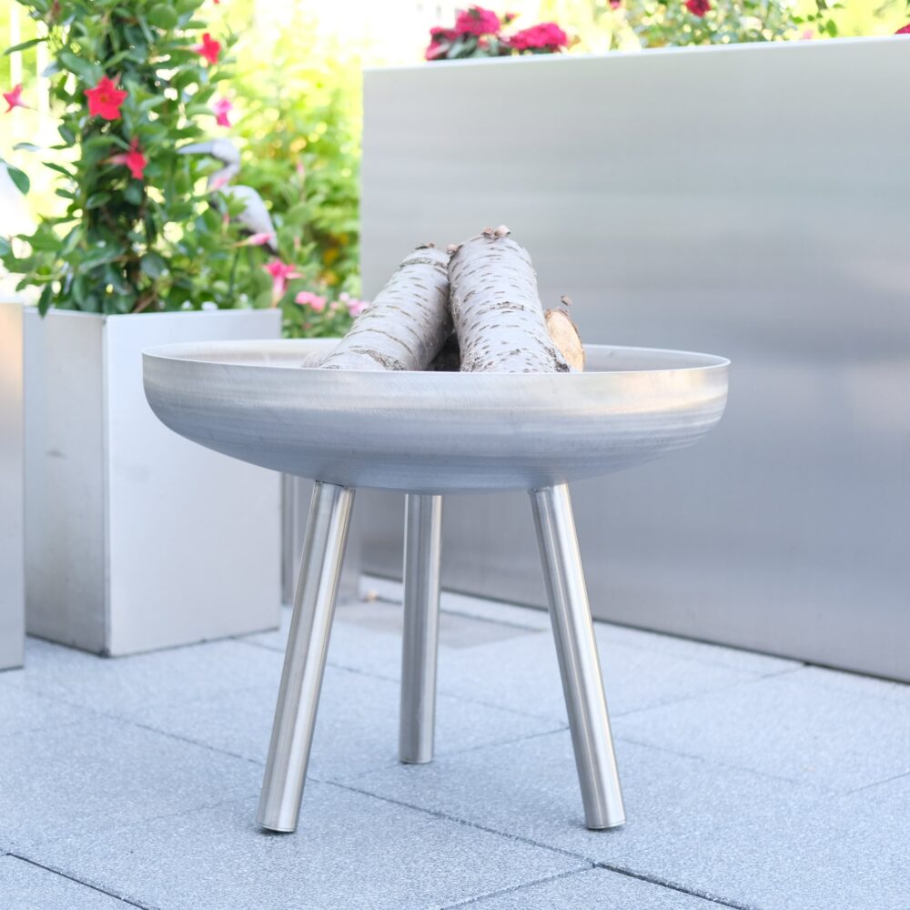 Das Edelstahl Untergestell der Feuerschale ist 35 cm hoch und die Schale 15 cm tief – somit ist die Edelstahl Feuerschale insgesamt 50 cm hoch. Mit dieser Höhe schützen Sie den darunterliegenden Rasen Ihres Gartens vor der Hitze des Lagerfeuers und können schön entspannt die wohlige Wärme & Stimmung genießen. Die drei Edelstahl Füße der Feuerschale garantieren hierbei eine maximale Standfestigkeit.