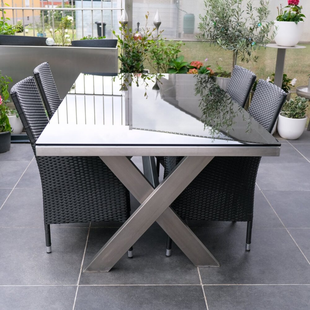 In unserer deutschen Stahlkunst Edelstahl Manufaktur bei Aachen wird der Gartentisch mit akribischer Präzision gefertigt. Jeder Arbeitsschritt – vom exakten Zuschnitt des Edelstahls bis zur finalen Oberflächenveredelung – wird hier umgesetzt. Die Glasplatte wird passgenau auf das Edelstahlgestell aufgelegt und von filigranen Auflagen getragen, die das Glas sicher fixieren und gleichzeitig den schwebenden Charakter betonen. Das Ergebnis ist ein luxuriöses Meisterwerk, das modernes Design, deutsches Handwerk und hohe Materialqualität vereint. Ein stilvolles Werkstück, das Ihr Outdoor-Ambiente über Jahrzehnte hinweg auf höchstem Niveau bereichert.