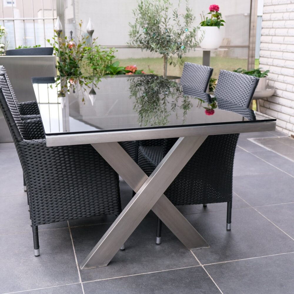 Der Designer Edelstahl Gartentisch „Noblesse“ vereint hohe Materialqualität mit luxuriöser Ästhetik. Sein massives Edelstahlgestell in klarer Linienführung trägt eine edle schwarze ESG-Glasplatte, die einen beeindruckenden Kontrast bildet. Das Zusammenspiel aus kühlem Edelstahl und glänzendem Glas schafft ein modernes, repräsentatives Gesamtbild, das sich nahtlos in exklusive Garten- und Terrassenlandschaften einfügt. Ob für stilvolle Dinner, gesellige Abende oder als elegantes Designstatement – dieser Tisch begeistert durch Eleganz, Größe und Ausdruckskraft.